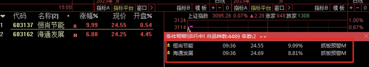 抓板预警 这是一个只做盘中9:30~10:30预警用,不当盘前盘后选股用,设置好预警条件后,盘中满足条件自动跳出个股决策,盘前或盘后选股结果无法测试。